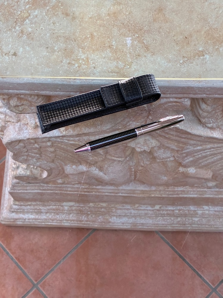 Edler Kugelschreiber von Balmain in schwarzem Etui und extra verpackt in schwarzer Geschenkverpackung, schwarzschreibend