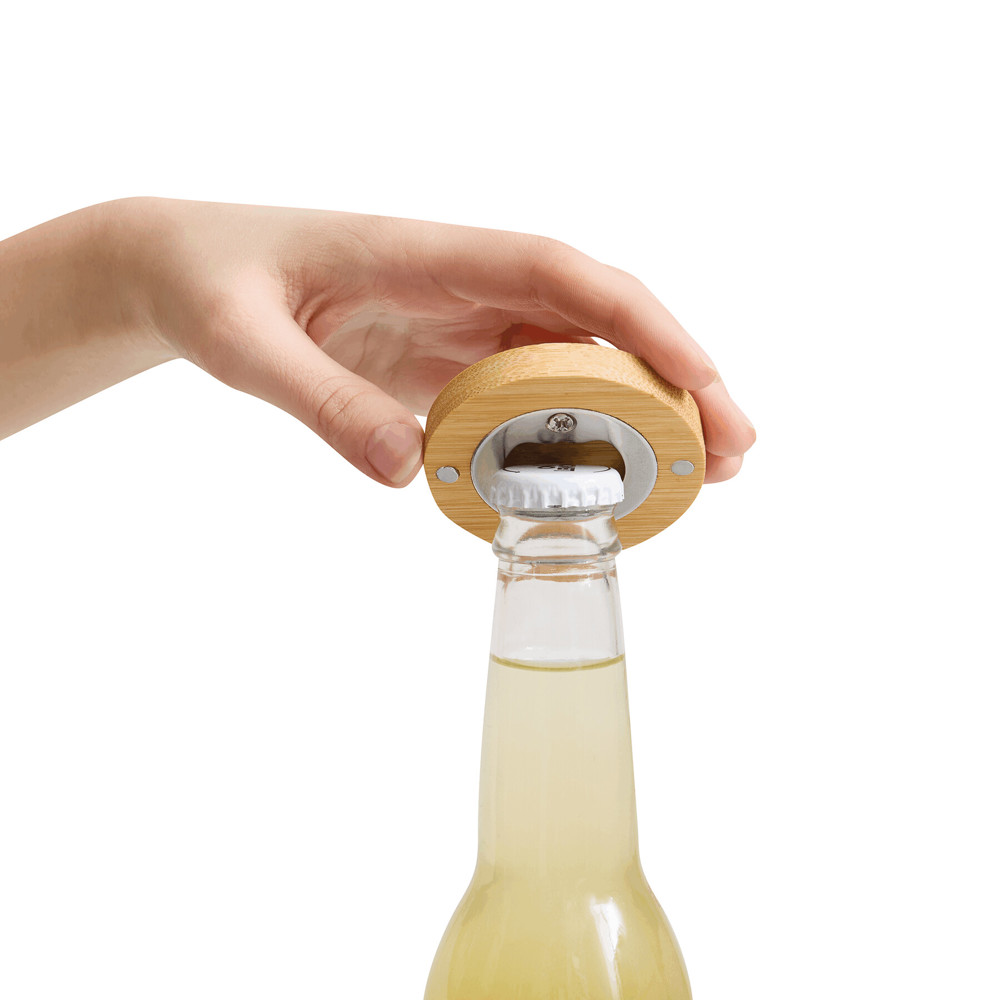Flaschenöffner BAMBOO COIN: mit zwei magnetischen Punkten zur Befestigung z. B. am Kühlschrank