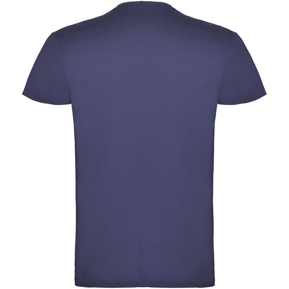 Kurzärmeliges T-Shirt mit doppellagigem Rundhalsausschnitt aus Elasthan, hergestellt aus schlauchförmigem Material für Erwachsene. Verstärkte und verdeckte Nähte am Kragen. Herausnehmbares Etikett. Das Modell ist 190 cm groß und trägt Größe L.