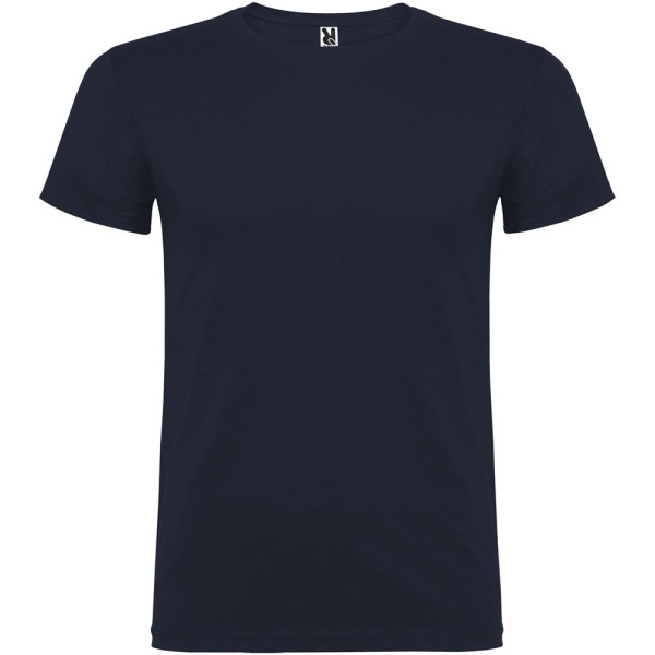 Kurzärmeliges T-Shirt mit doppellagigem Rundhalsausschnitt aus Elasthan, hergestellt aus schlauchförmigem Material für Erwachsene. Verstärkte und verdeckte Nähte am Kragen. Herausnehmbares Etikett. Das Modell ist 190 cm groß und trägt Größe L.