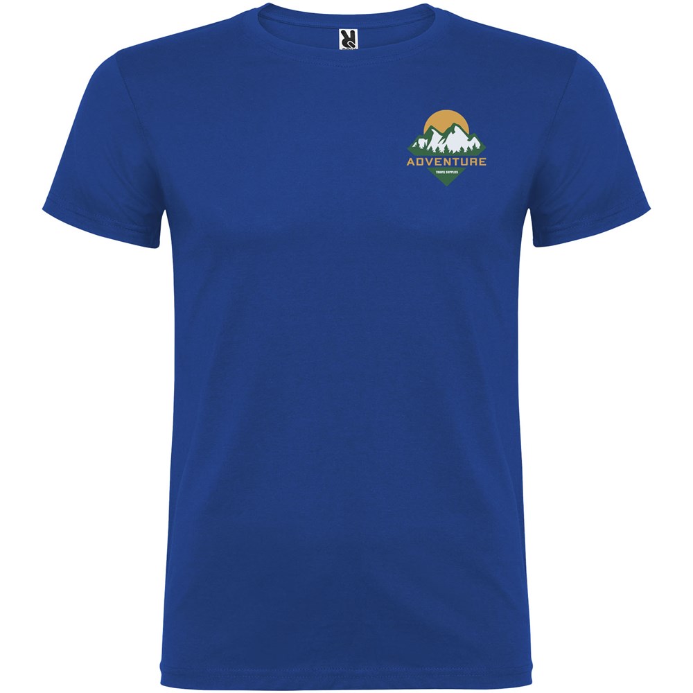 Kurzärmeliges T-Shirt mit doppellagigem Rundhalsausschnitt aus Elasthan, hergestellt aus schlauchförmigem Material für Erwachsene. Verstärkte und verdeckte Nähte am Kragen. Herausnehmbares Etikett. Das Modell ist 190 cm groß und trägt Größe L.