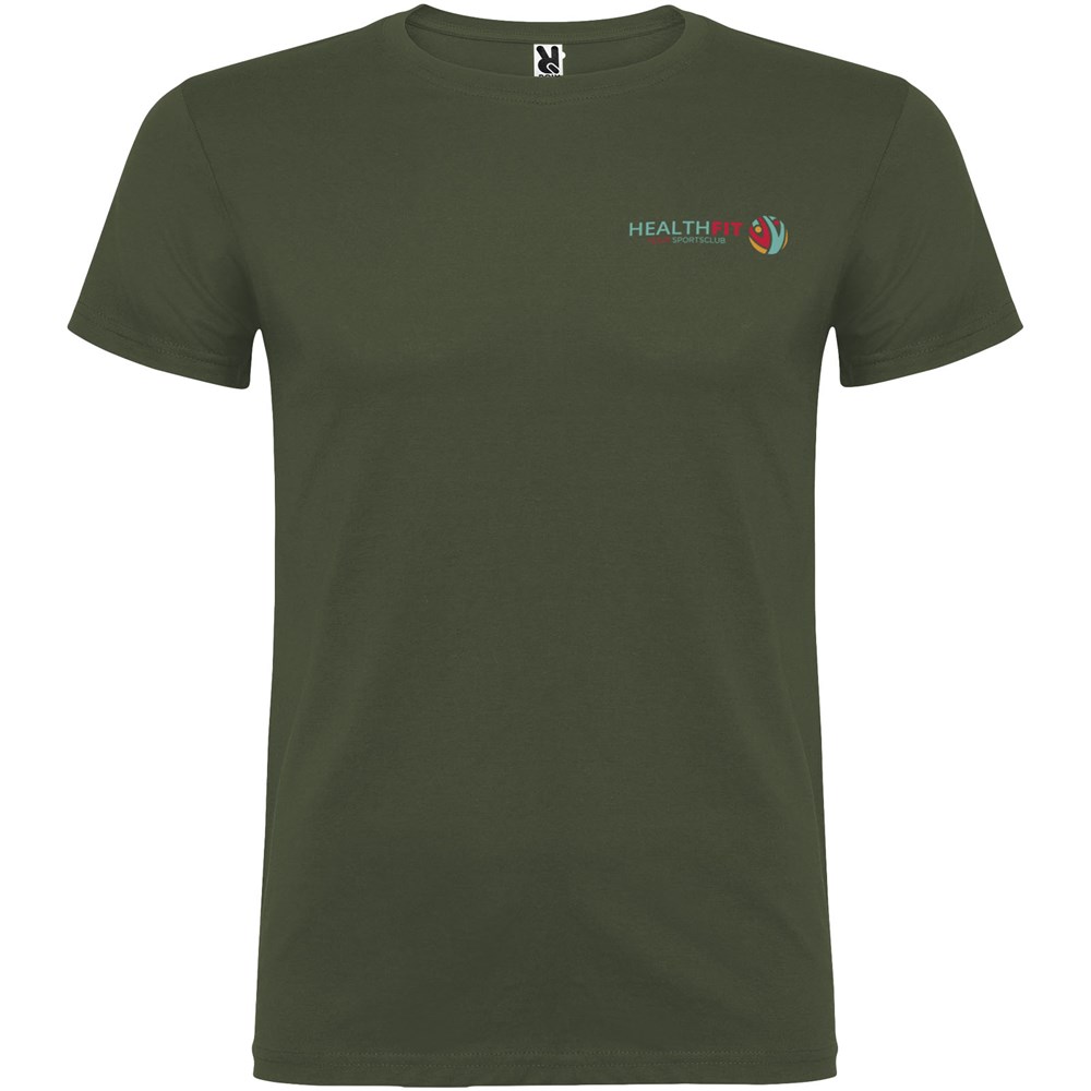 Kurzärmeliges T-Shirt mit doppellagigem Rundhalsausschnitt aus Elasthan, hergestellt aus schlauchförmigem Material für Erwachsene. Verstärkte und verdeckte Nähte am Kragen. Herausnehmbares Etikett. Das Modell ist 190 cm groß und trägt Größe L.