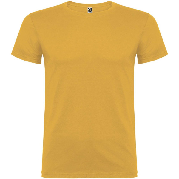 Kurzärmeliges T-Shirt mit doppellagigem Rundhalsausschnitt aus Elasthan, hergestellt aus schlauchförmigem Material für Erwachsene. Verstärkte und verdeckte Nähte am Kragen. Herausnehmbares Etikett. Das Modell ist 190 cm groß und trägt Größe L.