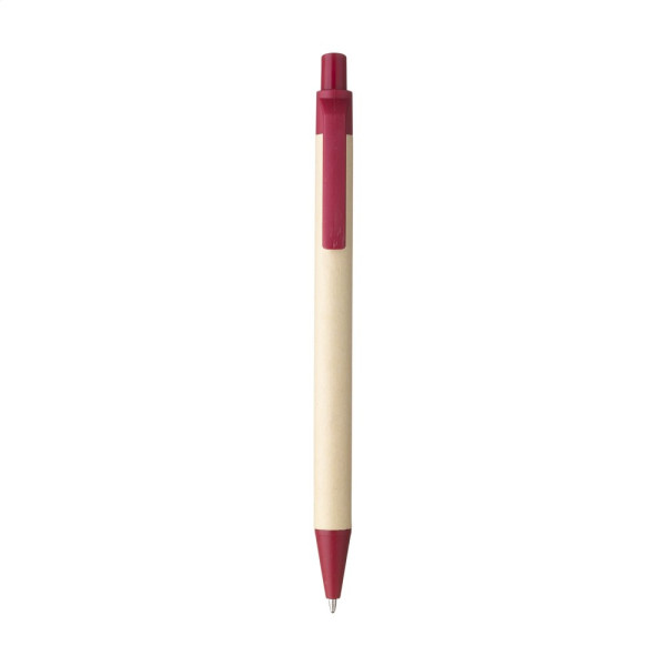 Kugelschreiber mit Halter aus Recyclingpapier. Der farbige Clip, der Druckknopf und die Spitze bestehen aus biologisch abbaubarem PLA. Mit blauer Tinte.