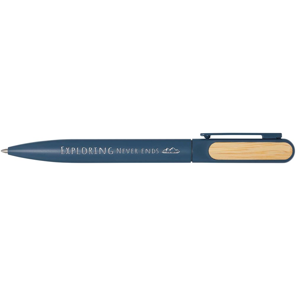 Der Blanca Kugelschreiber hat einen oberen Schaft aus recyceltem Kunststoff mit einer farbigen Sprühbeschichtung und Bambusaccessoires auf beiden Seiten. Der untere Teil des Schafts besteht aus recyceltem Aluminium mit einer farbigen Pulverbeschichtung. Tintenfarbe: Blau. Schreiblänge: 400 Meter. Strichstärke: 1,0 mm.
