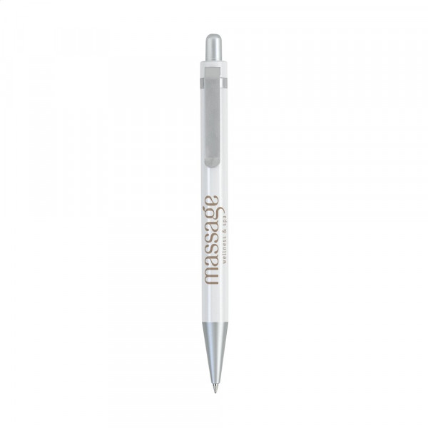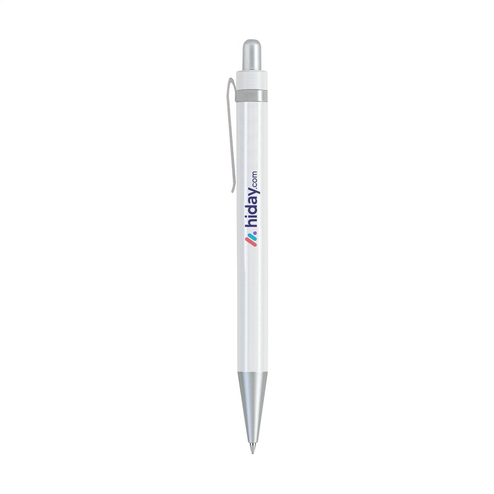 Blauschreibender Kugelschreiber mit mattmetallenem Clip. mehr