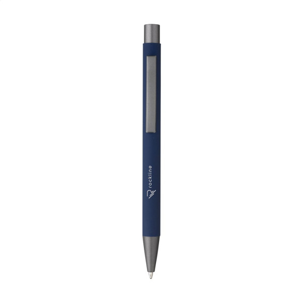 Blauschreibender Kugelschreiber aus recyceltem Aluminium. Das Gehäuse ist mit einer schönen gummierten Oberfläche versehen. Mit robustem Metallclip, Kunststoffspitze und Druckknopf. Durch die Verwendung von recyceltem Aluminium werden bei der Herstellung dieses Produkts weniger neue Rohstoffe verwendet. Das bedeutet weniger Energieverbrauch und weniger Wasserverbrauch.
