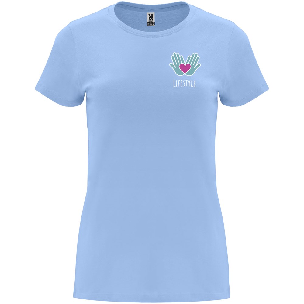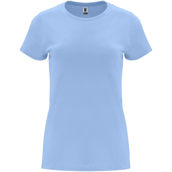 Tailliertes kurzärmeliges T-Shirt für Damen. Rundhalsausschnitt mit 1×1 Rippstrick. Verstärkte und verdeckte Nähte am Kragen. Herausnehmbares Etikett.
