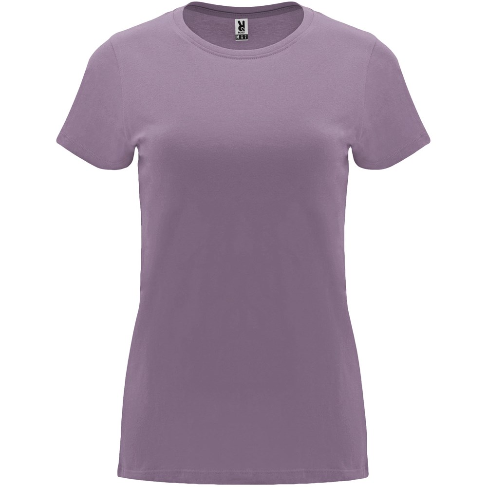 Tailliertes kurzärmeliges T-Shirt für Damen. Rundhalsausschnitt mit 1×1 Rippstrick. Verstärkte und verdeckte Nähte am Kragen. Herausnehmbares Etikett.