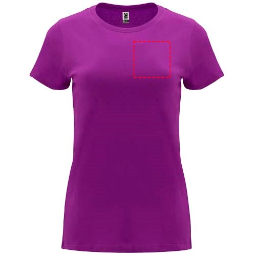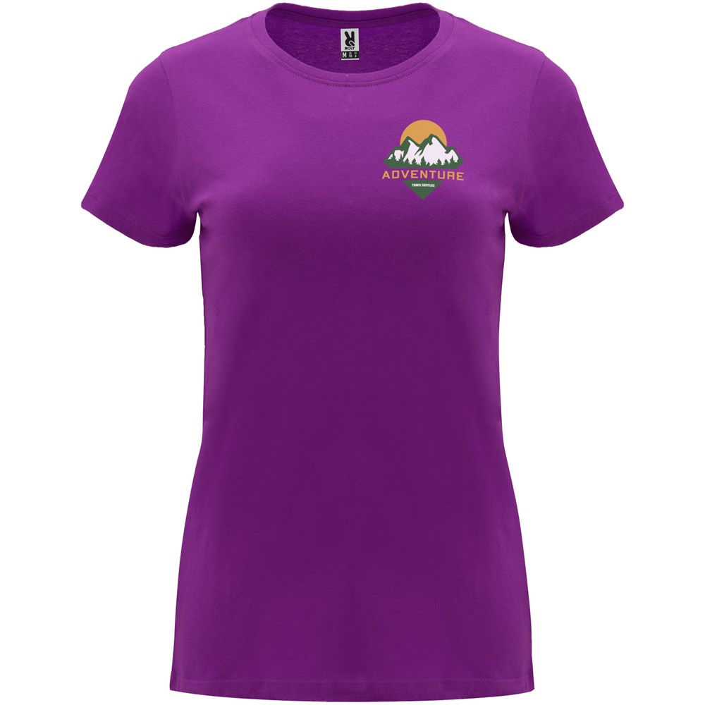 Tailliertes kurzärmeliges T-Shirt für Damen. Rundhalsausschnitt mit 1×1 Rippstrick. Verstärkte und verdeckte Nähte am Kragen. Herausnehmbares Etikett.