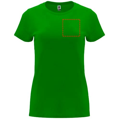 Tailliertes kurzärmeliges T-Shirt für Damen. Rundhalsausschnitt mit 1×1 Rippstrick. Verstärkte und verdeckte Nähte am Kragen. Herausnehmbares Etikett.