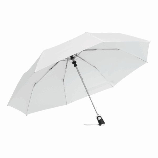 Automatik-Taschenschirm COVER: 3-teiliger Metallstock, Metallspeichen und -tips, gummierter Griff, Polyester-Pongee-Bespannung und -Hülle, Schließband mit Klettverschluss