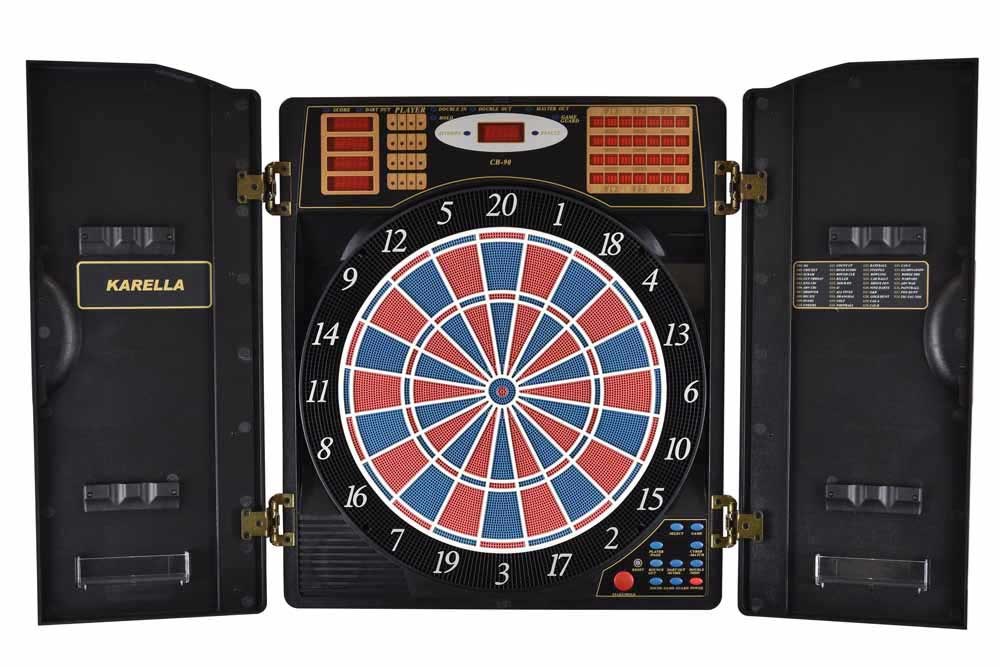 Dartautomat CB-90 im Cabinet, 12 Softdarts, Ersatzspitzen, Ersatzbarrels, Aufbau- und Gebrauchsanleitung und 220V-Netzteil.