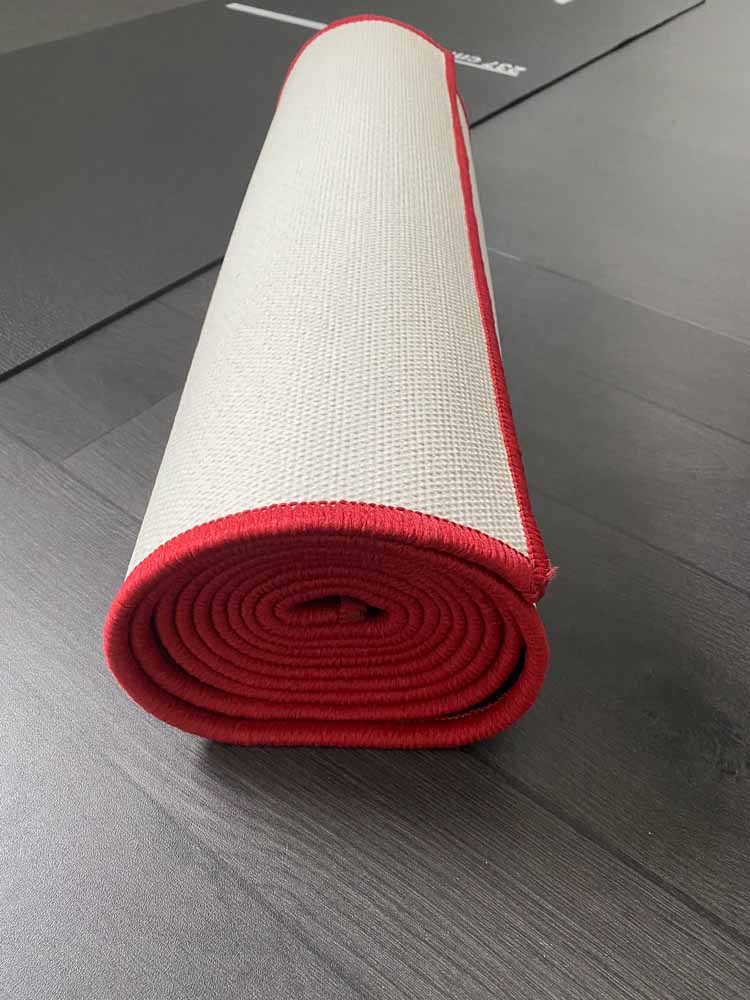 Die Dartmatte besteht aus sehr dichtem und äußerst strapazierfähigem 3 mm starken Nylonfloor (250g/m²). Die Unterseite der Matte ist mit einer absolut rutschfesten Latex-Gummibeschichtung versehen. Die Velourmatte lässt sich schnell ausrollen und passt sich sofort jedem Boden an. Auf der Oberseite ist der Rand zum Schutz der Kanten sehr hochwertig mit roter Randeinfassung und durch ein tolles Dartboard als Motiv optisch attraktiv gestaltet.