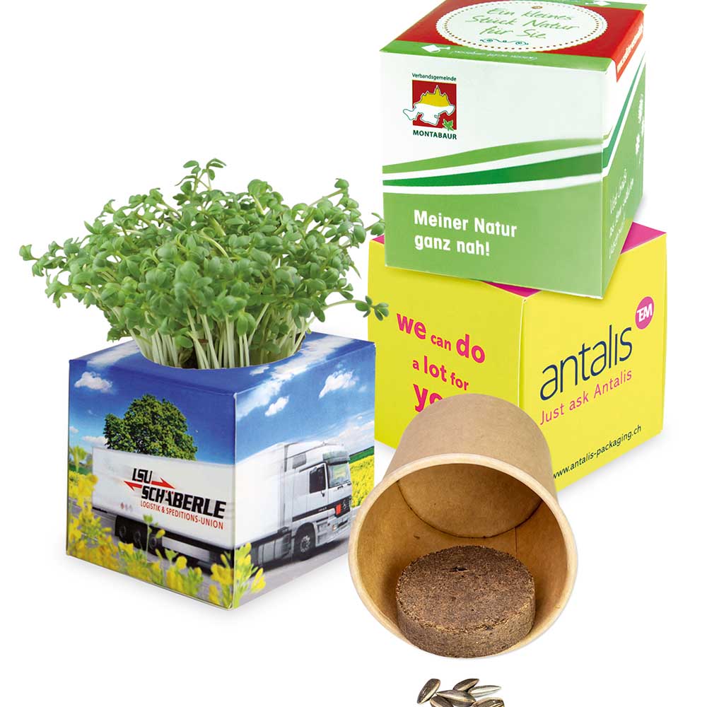 Das Geheimnis des Fliegengewichts ist der inliegende, wasserdichte Pappbecher. Darin befindet sich eine Substrattablette als Erde und der Samen nach Wahl. Viel Platz für die Werbebotschaft bieten die fünf Seiten des umliegenden Kartonwürfels, der komplett individuell gestaltbar ist. Auf der Unterseite ist die Pflanzanleitung.
