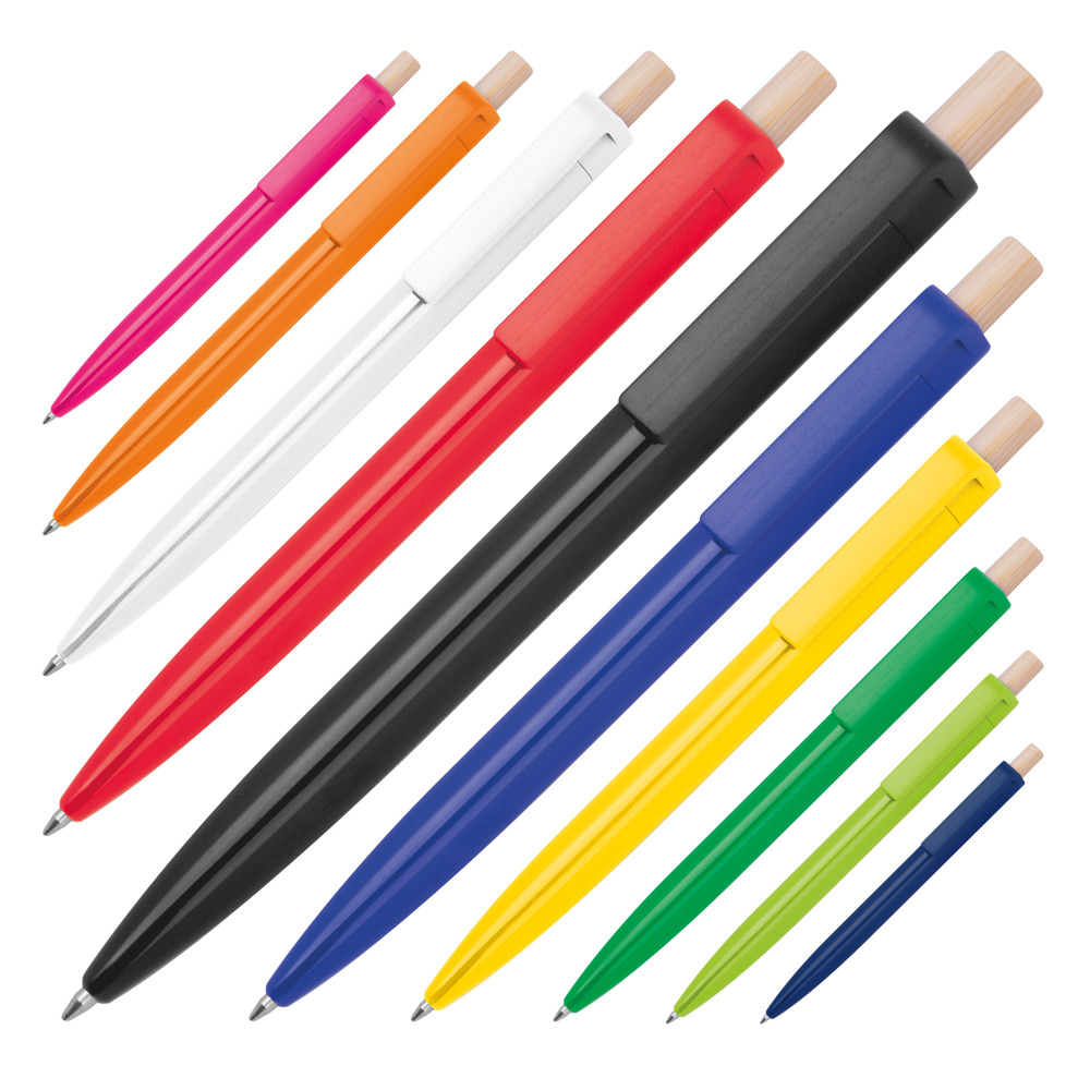 Kugelschreiber aus recyceltem ABS und einem Drücker aus Bambus. Er verfügt über eine blauschreibende Kunststoffmine. Ihre Werbung drucken wir unterhalb vom Clip aus den Schaft.