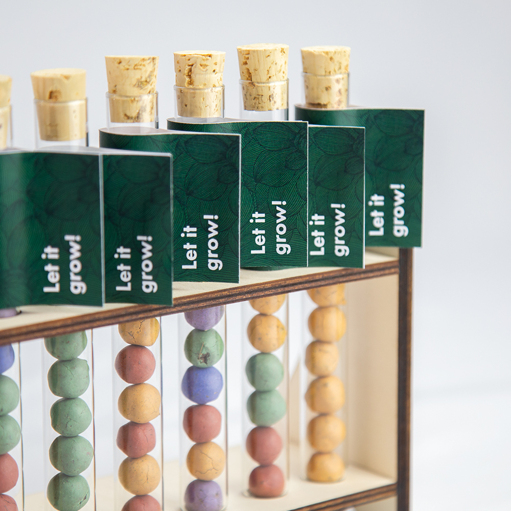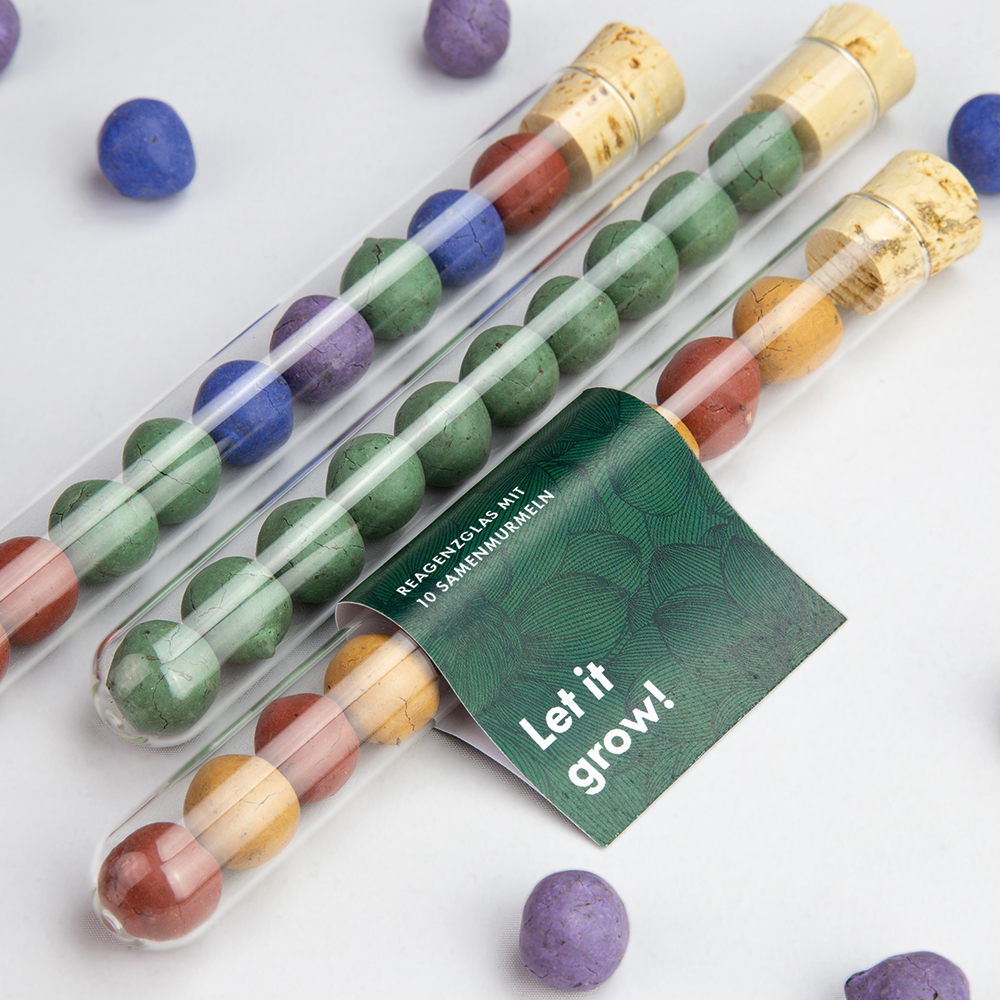 Das Reagenzglas „Tic Tac Toe“ verbindet spielerische Leichtigkeit mit einem echten Wachstumserlebnis. Gefüllt mit zehn kleinen Samenmurmeln aus Erde, Lehm und einem vielfältigen Samenmix enthält jedes Glas insgesamt 19 verschiedene Blumensamenarten. Die Samenmurmeln sind wahlweise einfarbig oder bunt gemischt erhältlich und stehen in den Farben Blau, Gelb, Rot, Violett, Grün oder Natur zur Auswahl. Durch die Verwendung ungiftiger Farben und natürlicher Inhaltsstoffe eignet sich das Produkt auch für den Einsatz in familiennahen Kontexten. Das hochwertige Reagenzglas wird in Deutschland gefertigt und kann mit einem individuell gestalteten Papierfähnchen personalisiert werden. So wird aus einem kleinen Give-away ein sympathischer Werbeartikel, der Freude bereitet und sichtbar aufblüht.
