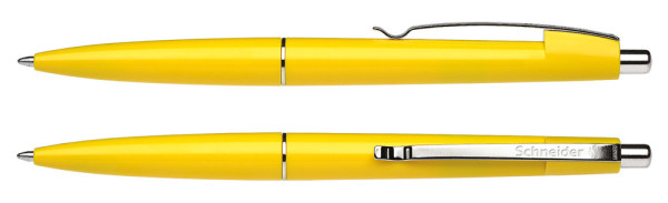 Druckkugelschreiber aus opakem Kunststoff mit glänzender Oberfläche. Clip, Zierring und Druckknopf aus Metall. Ausgestattet mit Schneider-Mine 770 M. Produkt mit finanziellem Klimabeitrag: Kompensation in Höhe der unvermeidbaren Emissionen in ein zertifiziertes Klimaschutzprojekt. Gehäuse: gelb. Schreibfarbe: blau.
