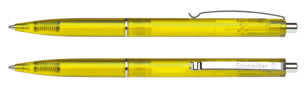 Druckkugelschreiber aus transparentem Kunststoff mit gefrosteter Oberfläche. Clip, Zierring und Druckknopf aus Metall. Ausgestattet mit Schneider-Mine 774 M. Produkt mit finanziellem Klimabeitrag: Kompensation in Höhe der unvermeidbaren Emissionen in ein zertifiziertes Klimaschutzprojekt. Gehäuse: gelb-transparent. Schreibfarbe: blau.