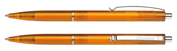 Druckkugelschreiber aus transparentem Kunststoff mit gefrosteter Oberfläche. Clip, Zierring und Druckknopf aus Metall. Ausgestattet mit Schneider-Mine 774 M. Produkt mit finanziellem Klimabeitrag: Kompensation in Höhe der unvermeidbaren Emissionen in ein zertifiziertes Klimaschutzprojekt. Gehäuse: orange-transparent. Schreibfarbe: blau.