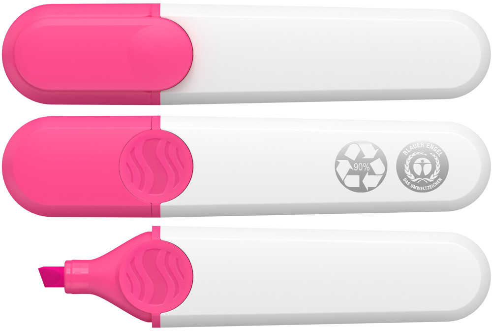 Textmarker aus opakem Kunststoff mit fein mattierter Oberfläche. Ausgezeichnet mit dem weltweit bekanntesten Umweltzeichen "Blauer Engel". *Gehäuse aus über 90 % recyceltem Kunststoff. Der innere Speicher und die Spitze bestehen aus Recyclingfasern, die Tinte wird aus biobasierten Rohstoffen hergestellt. Leuchtstarke, lichtbeständige Tinte. Für Normal-, Copy- und Faxpapier. Keilspitze 1+5 mm. Produkt mit finanziellem Klimabeitrag: Kompensation in Höhe der unvermeidbaren Emissionen in ein zertifiziertes Klimaschutzprojekt. Gehäuse: weiß/rosa. Schreibfarbe: rosa.