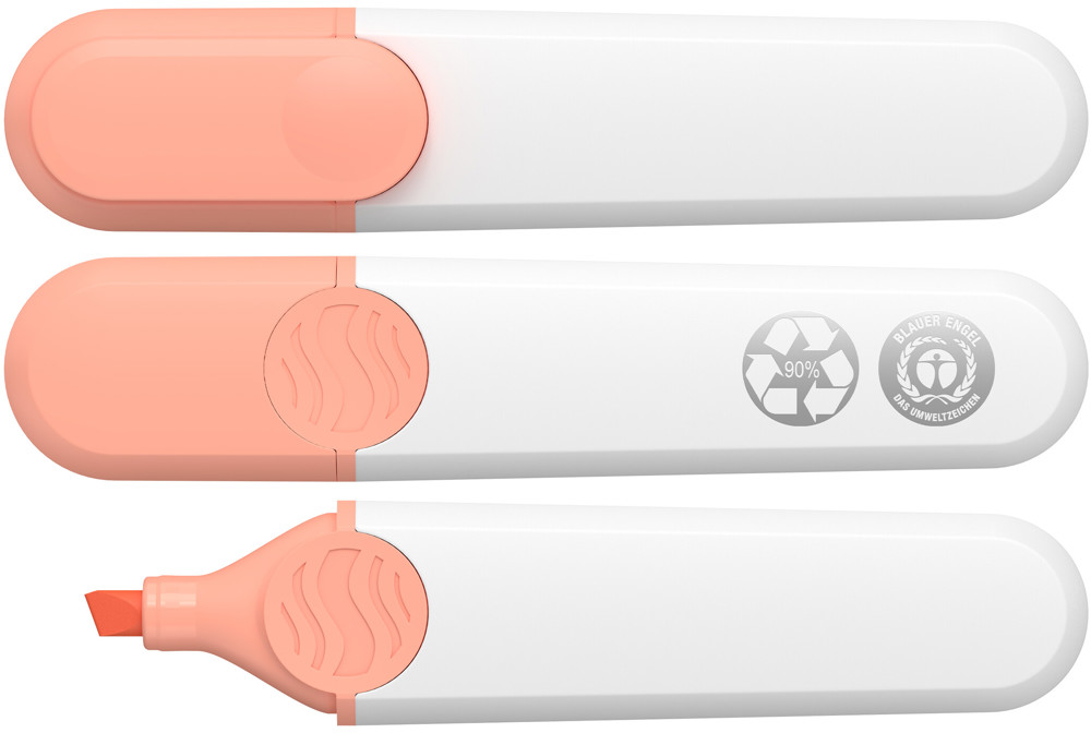 Textmarker aus opakem Kunststoff mit fein mattierter Oberfläche. Ausgezeichnet mit dem weltweit bekanntesten Umweltzeichen "Blauer Engel". *Gehäuse aus über 90 % recyceltem Kunststoff. Der innere Speicher und die Spitze bestehen aus Recyclingfasern, die Tinte wird aus biobasierten Rohstoffen hergestellt. Leuchtstarke, lichtbeständige Tinte. Für Normal-, Copy- und Faxpapier. Keilspitze 1+5 mm. Produkt mit finanziellem Klimabeitrag: Kompensation in Höhe der unvermeidbaren Emissionen in ein zertifiziertes Klimaschutzprojekt. Gehäuse: weiß/pfirsich. Schreibfarbe: pfirsich.