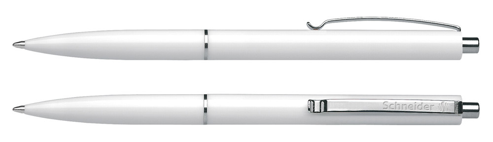 Druckkugelschreiber aus opakem Kunststoff mit glänzender Oberfläche. Clip, Zierring und Druckknopf aus Metall. Ausgestattet mit Schneider-Mine 770 M. Produkt mit finanziellem Klimabeitrag: Kompensation in Höhe der unvermeidbaren Emissionen in ein zertifiziertes Klimaschutzprojekt. Gehäuse: weiß. Schreibfarbe: blau.