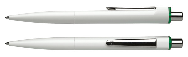 Druckkugelschreiber mit *Gehäuse aus > 62 % biobasiertem Kunststoff. Clip und Druckknopf aus Metall. Ausgestattet mit Schneider-Großraummine Express 739 M. Produkt mit finanziellem Klimabeitrag: Kompensation in Höhe der unvermeidbaren Emissionen in ein zertifiziertes Klimaschutzprojekt. Gehäuse: weiß/grün-transparent. Schreibfarbe: blau.
