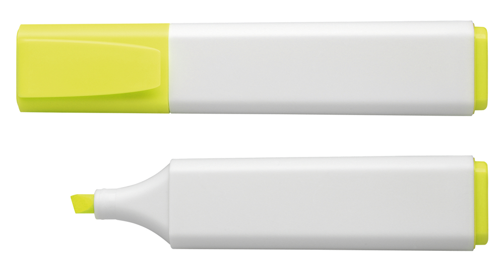 Textmarker aus opakem Kunststoff mit fein mattierter Oberfläche. Leuchtstarke, lichtbeständige Tinte. Für Normal-, Copy- und Faxpapier. Keilspitze 1+5 mm. Produkt mit finanziellem Klimabeitrag: Kompensation in Höhe der unvermeidbaren Emissionen in ein zertifiziertes Klimaschutzprojekt. Gehäuse: weiß/gelb. Schreibfarbe: gelb.