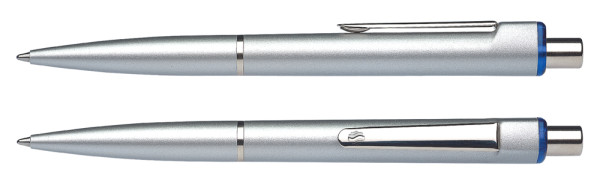 Druckkugelschreiber aus Kunststoff mit hochwertiger glänzender Silberlackierung. Clip, Zierring und Druckknopf aus Metall. Ausgestattet mit Schneider-Mine 774 M. Produkt mit finanziellem Klimabeitrag: Kompensation in Höhe der unvermeidbaren Emissionen in ein zertifiziertes Klimaschutzprojekt. Gehäuse: silber/blau-transparent. Schreibfarbe: blau.