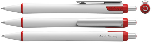 Druckkugelschreiber mit weißem *Gehäuse aus 70 % biobasiertem Kunststoff. Die Viscoglide®-Technologie sorgt für außergewöhnlich weiches und gleitendes Schreiben. Leicht konkav geformter Schaft und stabiler Metallclip. Zierring und Schaftverlängerung farblich abgesetzt. Ausgestattet mit Schneider-Mine 778 XB. Produkt mit finanziellem Klimabeitrag: Kompensation in Höhe der unvermeidbaren Emissionen in ein zertifiziertes Klimaschutzprojekt. Gehäuse: weiß/rot. Schreibfarbe: blau.