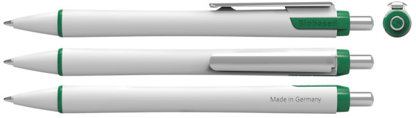 Druckkugelschreiber mit weißem *Gehäuse aus 70 % biobasiertem Kunststoff. Die Viscoglide®-Technologie sorgt für außergewöhnlich weiches und gleitendes Schreiben. Leicht konkav geformter Schaft und stabiler Metallclip. Zierring und Schaftverlängerung farblich abgesetzt. Ausgestattet mit Schneider-Mine 778 XB. Produkt mit finanziellem Klimabeitrag: Kompensation in Höhe der unvermeidbaren Emissionen in ein zertifiziertes Klimaschutzprojekt. Gehäuse: weiß/grün. Schreibfarbe: blau.