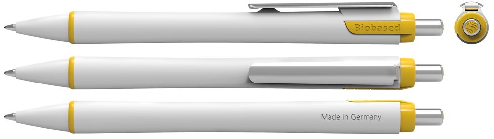 Druckkugelschreiber mit weißem *Gehäuse aus 70 % biobasiertem Kunststoff. Die Viscoglide®-Technologie sorgt für außergewöhnlich weiches und gleitendes Schreiben. Leicht konkav geformter Schaft und stabiler Metallclip. Zierring und Schaftverlängerung farblich abgesetzt. Ausgestattet mit Schneider-Mine 778 XB. Produkt mit finanziellem Klimabeitrag: Kompensation in Höhe der unvermeidbaren Emissionen in ein zertifiziertes Klimaschutzprojekt. Gehäuse: weiß/gelb. Schreibfarbe: blau.