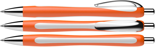 Druckkugelschreiber mit Viscoglide®-Technologie für außergewöhnlich weiches und gleitendes Schreiben. Ergonomische Form mit gummierter Oberfläche. Clip und Spitze aus Metall. Ausgestattet mit Schneider-Metall-Großraummine Slider 755 XB. Produkt mit finanziellem Klimabeitrag: Kompensation in Höhe der unvermeidbaren Emissionen in ein zertifiziertes Klimaschutzprojekt. Gehäuse: weiß-orange. Schreibfarbe: schwarz.