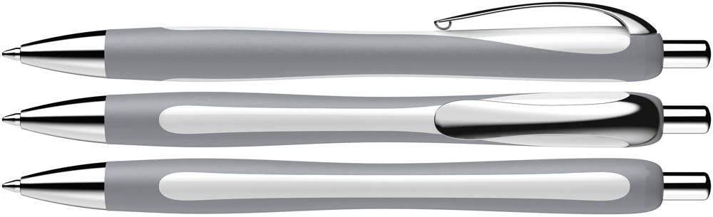 Druckkugelschreiber mit Viscoglide®-Technologie für außergewöhnlich weiches und gleitendes Schreiben. Ergonomische Form mit gummierter Oberfläche. Clip und Spitze aus Metall. Ausgestattet mit Schneider-Metall-Großraummine Slider 755 XB. Produkt mit finanziellem Klimabeitrag: Kompensation in Höhe der unvermeidbaren Emissionen in ein zertifiziertes Klimaschutzprojekt. Gehäuse: hellgrau/weiß. Schreibfarbe: blau.