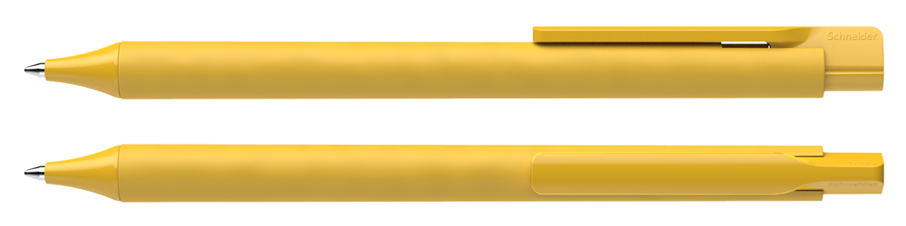 Druckkugelschreiber aus opakem Kunststoff. Oberteil mit mattierter Soft-Touch-Lackierung, Cliphülse und Spitze mit glänzender Oberfläche. Ausgestattet mit Schneider-Mine 774 M. Produkt mit finanziellem Klimabeitrag: Kompensation in Höhe der unvermeidbaren Emissionen in ein zertifiziertes Klimaschutzprojekt. Gehäuse: gelb. Schreibfarbe: blau.
