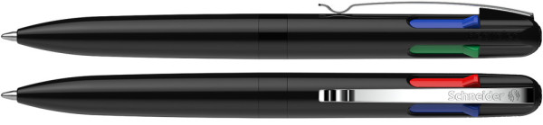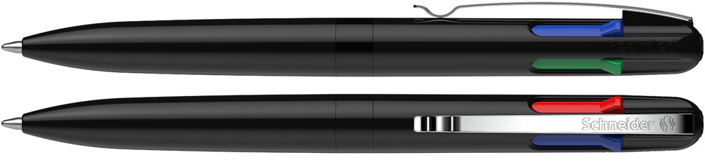 Vierfarb-Kugelschreiber mit den Schreibfarben schwarz, rot, blau und grün. Schneller und komfortabler Farbwechsel durch farbige Schieber. Umwelt- und ressourcenschonend mit einem *Gehäuse aus 92 % Recycling-Kunststoff. Stabiler Metallclip. Mit Viscoglide®-Technologie für außergewöhnlich weiches und gleitendes Schreiben. Strichstärke Medium (M). Nachfüllbar mit Schneider-Mine „Take 4 Refill“. Produkt mit finanziellem Klimabeitrag: Kompensation in Höhe der unvermeidbaren Emissionen in ein zertifiziertes Klimaschutzprojekt. Gehäuse: schwarz/schwarz. Schreibfarbe: schwarz + rot + grün + blau.