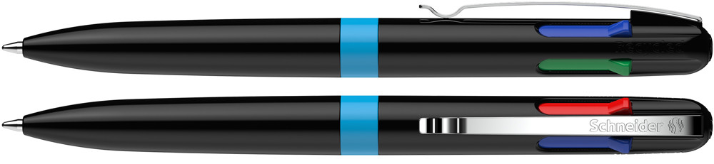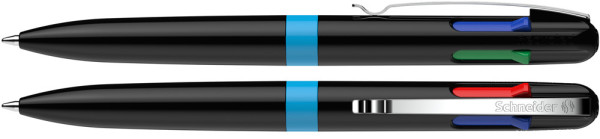 Vierfarb-Kugelschreiber mit den Schreibfarben schwarz, rot, blau und grün. Schneller und komfortabler Farbwechsel durch farbige Schieber. Umwelt- und ressourcenschonend mit einem *Gehäuse aus 92 % Recycling-Kunststoff. Stabiler Metallclip. Mit Viscoglide®-Technologie für außergewöhnlich weiches und gleitendes Schreiben. Strichstärke Medium (M). Nachfüllbar mit Schneider-Mine „Take 4 Refill“. Produkt mit finanziellem Klimabeitrag: Kompensation in Höhe der unvermeidbaren Emissionen in ein zertifiziertes Klimaschutzprojekt. Gehäuse: schwarz/cyan . Schreibfarbe: schwarz + rot + grün + blau.
