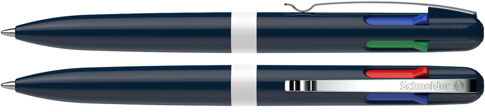 Vierfarb-Kugelschreiber mit den Schreibfarben schwarz, rot, blau und grün. Schneller und komfortabler Farbwechsel durch farbige Schieber. Umwelt- und ressourcenschonend mit einem *Gehäuse aus 92 % Recycling-Kunststoff. Stabiler Metallclip. Mit Viscoglide®-Technologie für außergewöhnlich weiches und gleitendes Schreiben. Strichstärke Medium (M). Nachfüllbar mit Schneider-Mine „Take 4 Refill“. Produkt mit finanziellem Klimabeitrag: Kompensation in Höhe der unvermeidbaren Emissionen in ein zertifiziertes Klimaschutzprojekt. Gehäuse: tiefblau/weiß. Schreibfarbe: schwarz + rot + grün + blau.