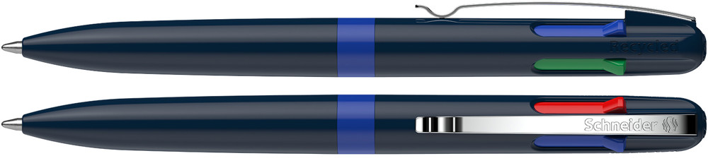 Vierfarb-Kugelschreiber mit den Schreibfarben schwarz, rot, blau und grün. Schneller und komfortabler Farbwechsel durch farbige Schieber. Umwelt- und ressourcenschonend mit einem *Gehäuse aus 92 % Recycling-Kunststoff. Stabiler Metallclip. Mit Viscoglide®-Technologie für außergewöhnlich weiches und gleitendes Schreiben. Strichstärke Medium (M). Nachfüllbar mit Schneider-Mine „Take 4 Refill“. Produkt mit finanziellem Klimabeitrag: Kompensation in Höhe der unvermeidbaren Emissionen in ein zertifiziertes Klimaschutzprojekt. Gehäuse: tiefblau/blau. Schreibfarbe: schwarz + rot + grün + blau.