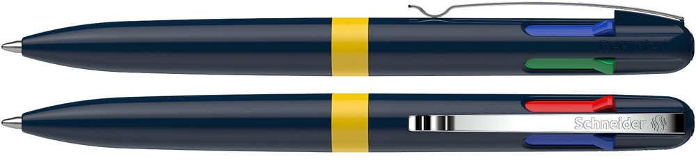 Vierfarb-Kugelschreiber mit den Schreibfarben schwarz, rot, blau und grün. Schneller und komfortabler Farbwechsel durch farbige Schieber. Umwelt- und ressourcenschonend mit einem *Gehäuse aus 92 % Recycling-Kunststoff. Stabiler Metallclip. Mit Viscoglide®-Technologie für außergewöhnlich weiches und gleitendes Schreiben. Strichstärke Medium (M). Nachfüllbar mit Schneider-Mine „Take 4 Refill“. Produkt mit finanziellem Klimabeitrag: Kompensation in Höhe der unvermeidbaren Emissionen in ein zertifiziertes Klimaschutzprojekt. Gehäuse: tiefblau/gelb. Schreibfarbe: schwarz + rot + grün + blau.