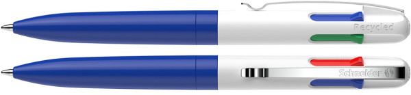 Vierfarb-Kugelschreiber mit den Schreibfarben schwarz, rot, blau und grün. Schneller und komfortabler Farbwechsel durch farbige Schieber. Umwelt- und ressourcenschonend mit einem *Gehäuse aus 92 % Recycling-Kunststoff. Stabiler Metallclip. Mit Viscoglide®-Technologie für außergewöhnlich weiches und gleitendes Schreiben. Strichstärke Medium (M). Nachfüllbar mit Schneider-Mine „Take 4 Refill“. Produkt mit finanziellem Klimabeitrag: Kompensation in Höhe der unvermeidbaren Emissionen in ein zertifiziertes Klimaschutzprojekt. Gehäuse: blau-blau-weiß. Schreibfarbe: schwarz + rot + grün + blau.