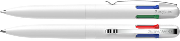 Vierfarb-Kugelschreiber mit den Schreibfarben schwarz, rot, blau und grün. Schneller und komfortabler Farbwechsel durch farbige Schieber. Umwelt- und ressourcenschonend mit einem *Gehäuse aus 92 % Recycling-Kunststoff. Stabiler Metallclip. Mit Viscoglide®-Technologie für außergewöhnlich weiches und gleitendes Schreiben. Strichstärke Medium (M). Nachfüllbar mit Schneider-Mine „Take 4 Refill“. Produkt mit finanziellem Klimabeitrag: Kompensation in Höhe der unvermeidbaren Emissionen in ein zertifiziertes Klimaschutzprojekt. Gehäuse: weiß/weiß . Schreibfarbe: schwarz + rot + grün + blau.