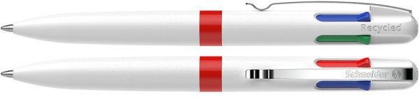 Vierfarb-Kugelschreiber mit den Schreibfarben schwarz, rot, blau und grün. Schneller und komfortabler Farbwechsel durch farbige Schieber. Umwelt- und ressourcenschonend mit einem *Gehäuse aus 92 % Recycling-Kunststoff. Stabiler Metallclip. Mit Viscoglide®-Technologie für außergewöhnlich weiches und gleitendes Schreiben. Strichstärke Medium (M). Nachfüllbar mit Schneider-Mine „Take 4 Refill“. Produkt mit finanziellem Klimabeitrag: Kompensation in Höhe der unvermeidbaren Emissionen in ein zertifiziertes Klimaschutzprojekt. Gehäuse: weiß/rot . Schreibfarbe: schwarz + rot + grün + blau.