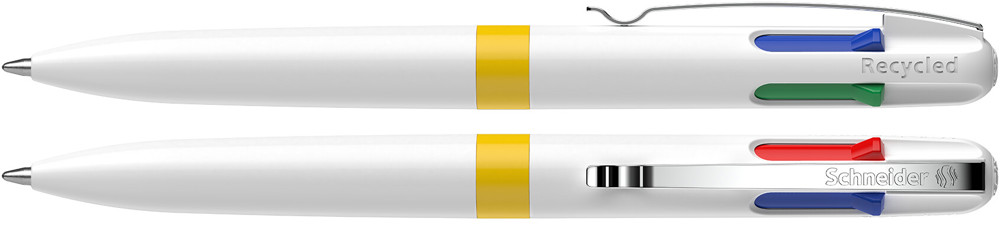 Vierfarb-Kugelschreiber mit den Schreibfarben schwarz, rot, blau und grün. Schneller und komfortabler Farbwechsel durch farbige Schieber. Umwelt- und ressourcenschonend mit einem *Gehäuse aus 92 % Recycling-Kunststoff. Stabiler Metallclip. Mit Viscoglide®-Technologie für außergewöhnlich weiches und gleitendes Schreiben. Strichstärke Medium (M). Nachfüllbar mit Schneider-Mine „Take 4 Refill“. Produkt mit finanziellem Klimabeitrag: Kompensation in Höhe der unvermeidbaren Emissionen in ein zertifiziertes Klimaschutzprojekt. Gehäuse: weiß/gelb . Schreibfarbe: schwarz + rot + grün + blau.