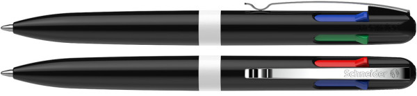 Vierfarb-Kugelschreiber mit den Schreibfarben schwarz, rot, blau und grün. Schneller und komfortabler Farbwechsel durch farbige Schieber. Umwelt- und ressourcenschonend mit einem *Gehäuse aus 92 % Recycling-Kunststoff. Stabiler Metallclip. Mit Viscoglide®-Technologie für außergewöhnlich weiches und gleitendes Schreiben. Strichstärke Medium (M). Nachfüllbar mit Schneider-Mine „Take 4 Refill“. Produkt mit finanziellem Klimabeitrag: Kompensation in Höhe der unvermeidbaren Emissionen in ein zertifiziertes Klimaschutzprojekt. Gehäuse: schwarz/weiß. Schreibfarbe: schwarz + rot + grün + blau.
