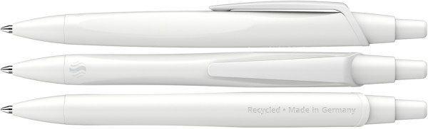 Erster Kugelschreiber, der mit dem weltweit bekanntesten Umweltzeichen "Blauer Engel" ausgezeichnet ist. Dynamisches Design mit elegant matt schimmernder Oberfläche. Umwelt- und ressourcenschonend mit einem *Gehäuse aus 92 % recyceltem Kunststoff hergestellt. Auswechselbare Großraummine Eco 725 M mit einem Gehäuse aus 95 % recyceltem Kunststoff. Produkt mit finanziellem Klimabeitrag: Kompensation in Höhe der unvermeidbaren Emissionen in ein zertifiziertes Klimaschutzprojekt. Gehäuse: weiß/weiß. Schreibfarbe: blau.