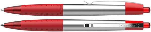 Druckkugelschreiber aus Kunststoff mit hochwertiger glänzender Silberlackierung und einer rutschfest gummierten Griffzone. Clip aus stabilem Edelstahl. Ausgestattet mit Schneider-Mine 774 M. Produkt mit finanziellem Klimabeitrag: Kompensation in Höhe der unvermeidbaren Emissionen in ein zertifiziertes Klimaschutzprojekt. Gehäuse: rot-transparent. Schreibfarbe: blau.
