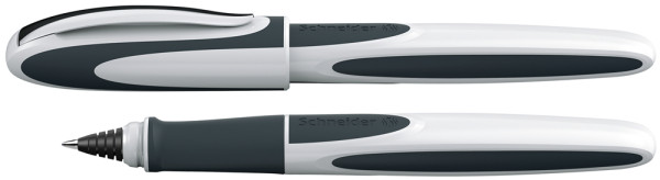 Tintenroller mit ergonomisch gummiertem Griffprofil und verschleißfester Edelstahlspitze. Standard-Tintenpatronen königsblau löschbar. Produkt mit finanziellem Klimabeitrag: Kompensation in Höhe der unvermeidbaren Emissionen in ein zertifiziertes Klimaschutzprojekt. Gehäuse: weiß/dunkelgrau. Schreibfarbe: blau.
