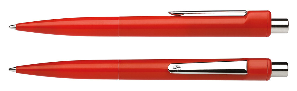Klassischer Druckkugelschreiber aus opakem Kunststoff mit glänzender Oberfläche. Clip und Druckknopf aus Metall. Ausgestattet mit Schneider-Mine 774 M. Produkt mit finanziellem Klimabeitrag: Kompensation in Höhe der unvermeidbaren Emissionen in ein zertifiziertes Klimaschutzprojekt. Gehäuse: rot. Schreibfarbe: blau.